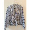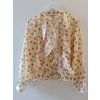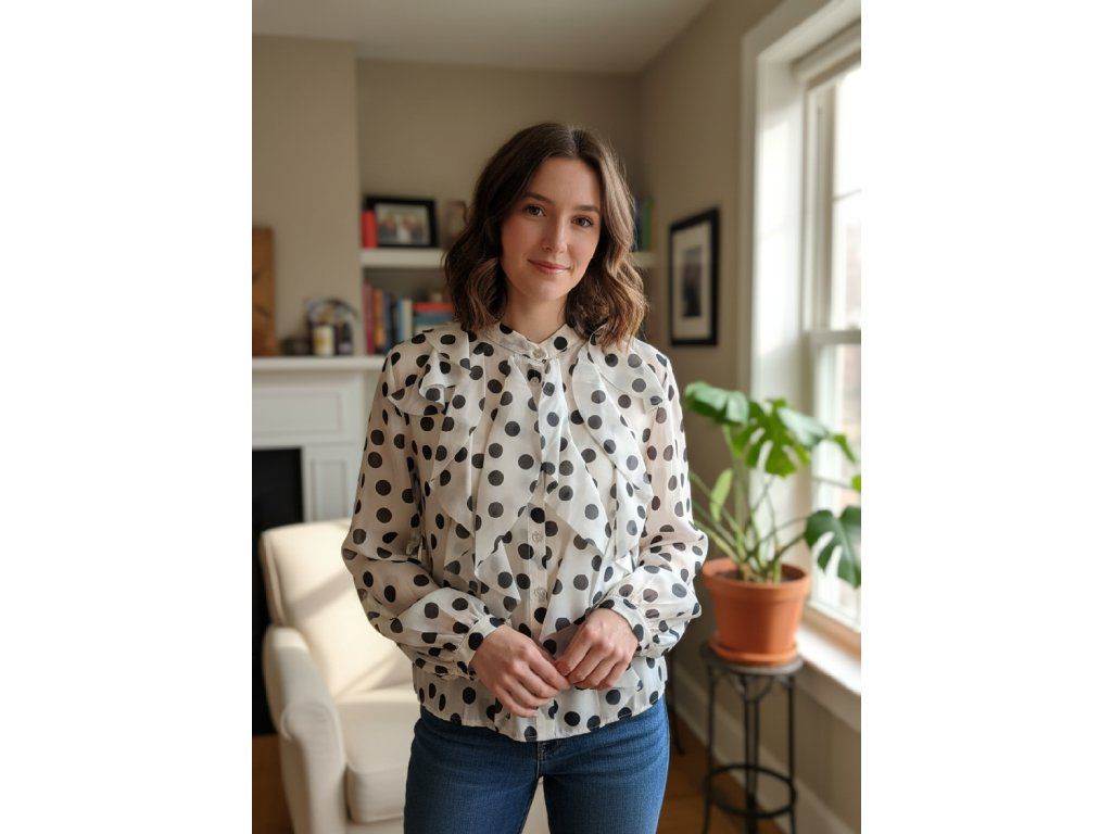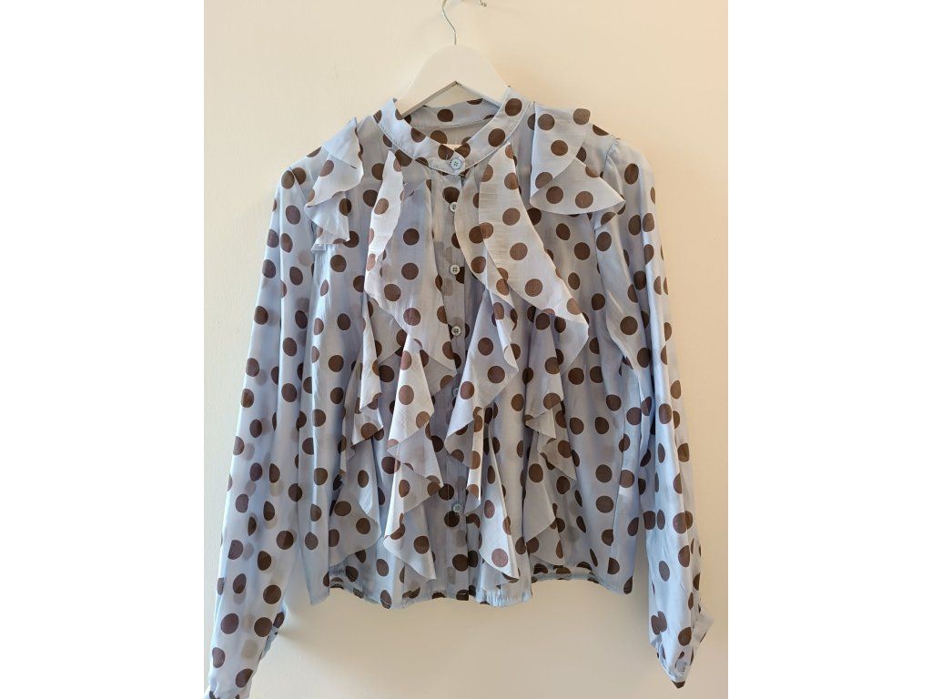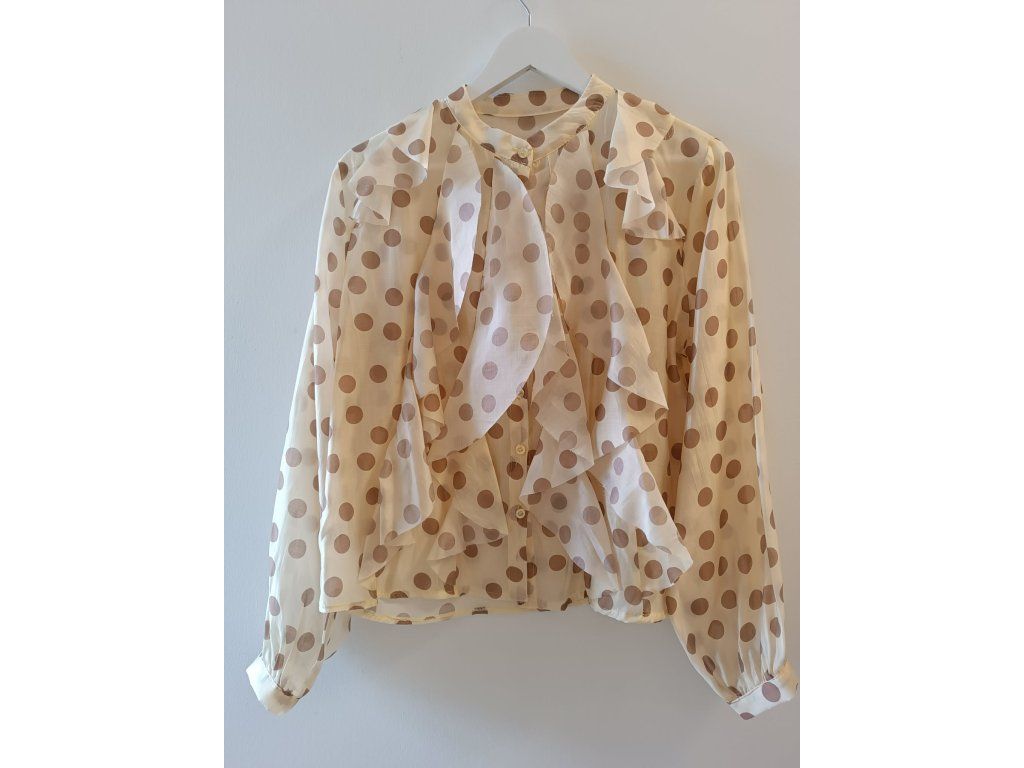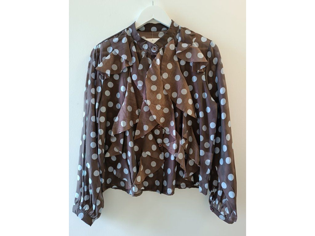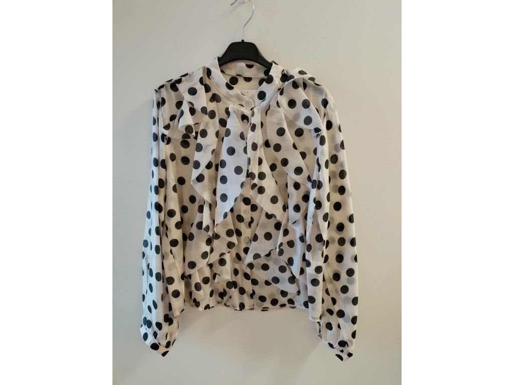 Lehká a elegantní halenka s nadčasovým puntíkovaným vzorem, která dodá každému outfitu ženskost a jemnou eleganci. Halenka je ušitá z příjemného, vzdušného materiálu a zaujme výrazným volánovým detailem v přední části, který vytváří romantický a zároveň sofistikovaný vzhled.