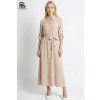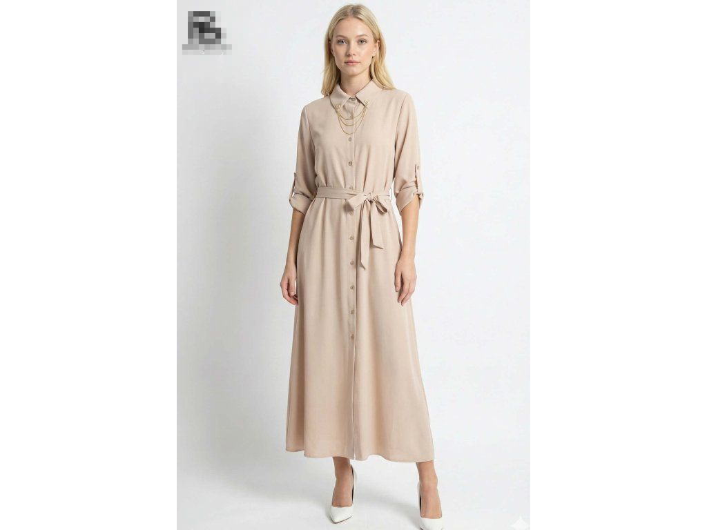 Elegantní košilové šaty v jemném (nejen) béžovém odstínu s nadčasovým límečkem a zapínáním na knoflíky. V pase mají pásek na zavazování, který krásně zvýrazní siluetu. Tříčtvrteční rukávy a volnější, splývavý střih zajišťují pohodlí při nošení. Skvělá volba pro každodenní outfit i elegantnější příležitosti.