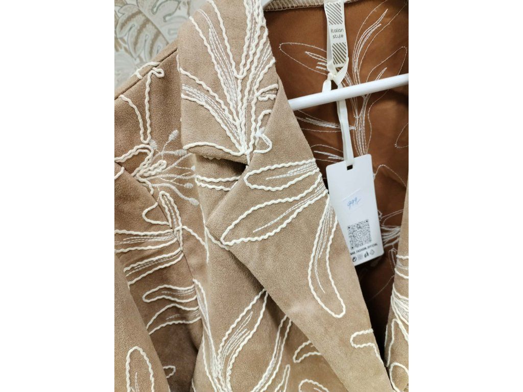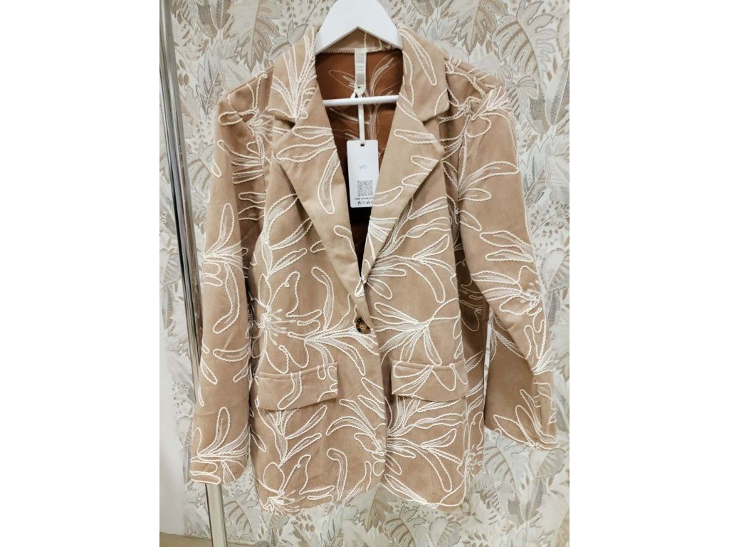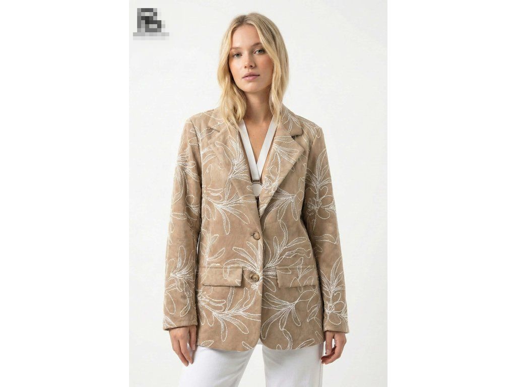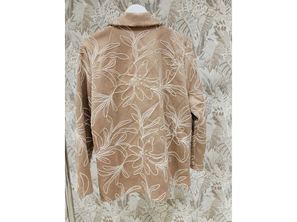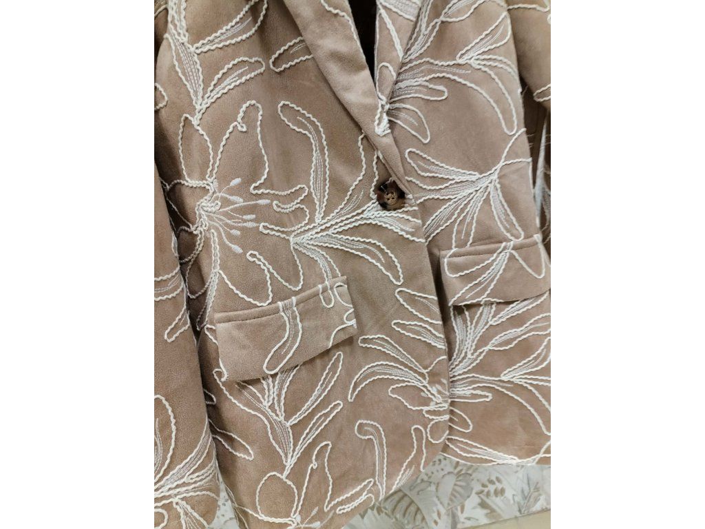 Elegantní dámské sako v jemném béžovém odstínu zaujme na první pohled svým originálním vyšívaným květinovým vzorem. Má klasický střih s límcem, zapínání na knoflíky a praktické kapsy, díky čemuž působí nadčasově a zároveň moderně. Příjemný materiál a pohodlný střih z něj dělají ideální kousek pro každodenní nošení i slavnostnější příležitosti. Skvěle se kombinuje s kalhotami, džínami i šaty a snadno doladí každý outfit.